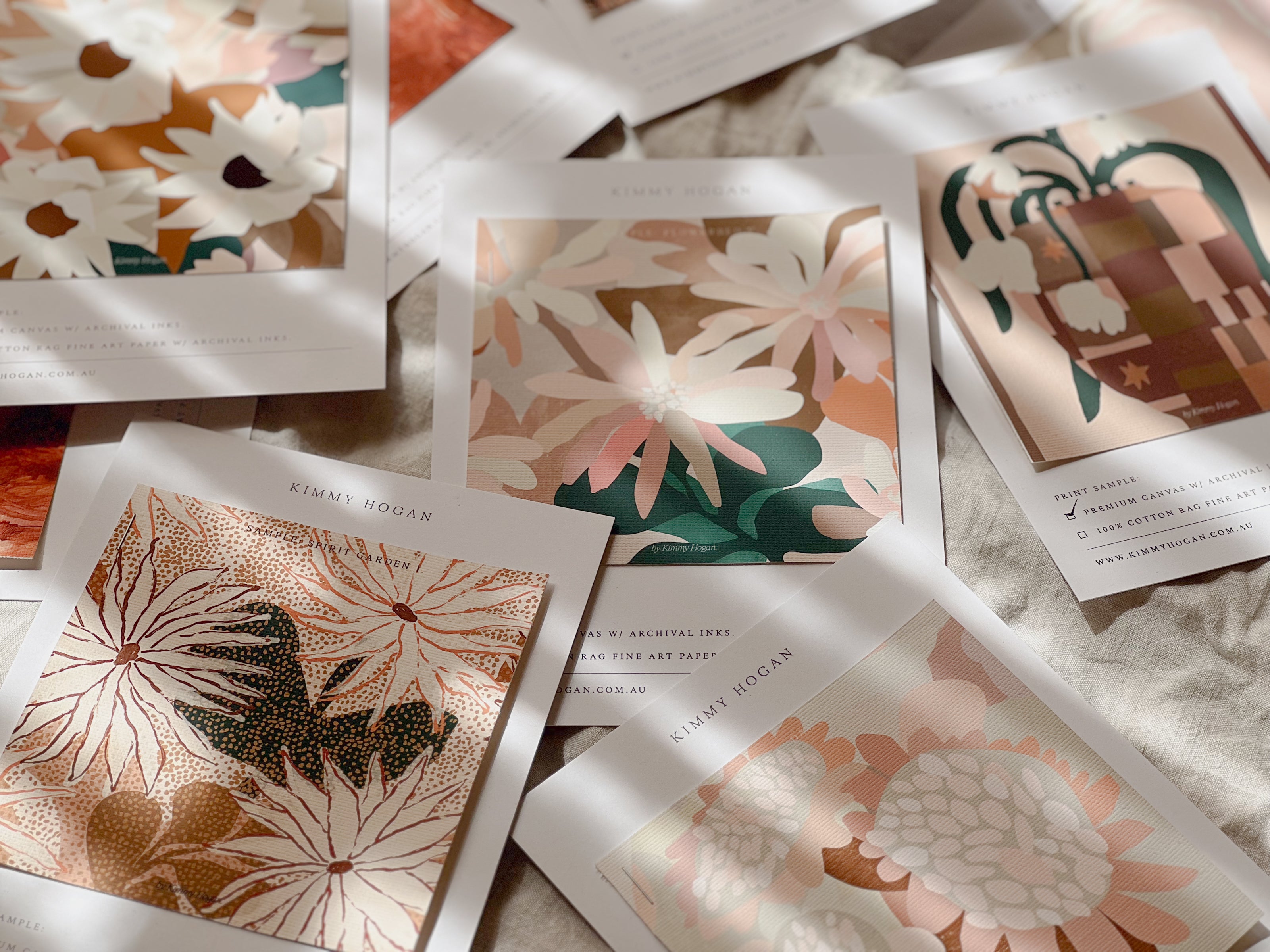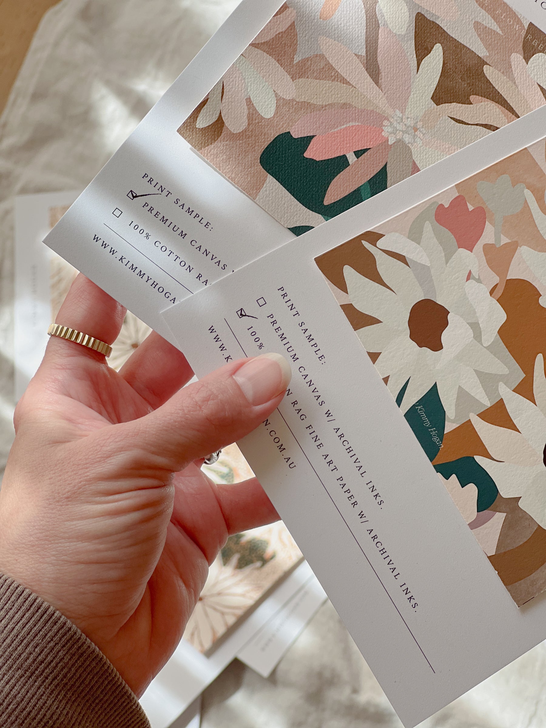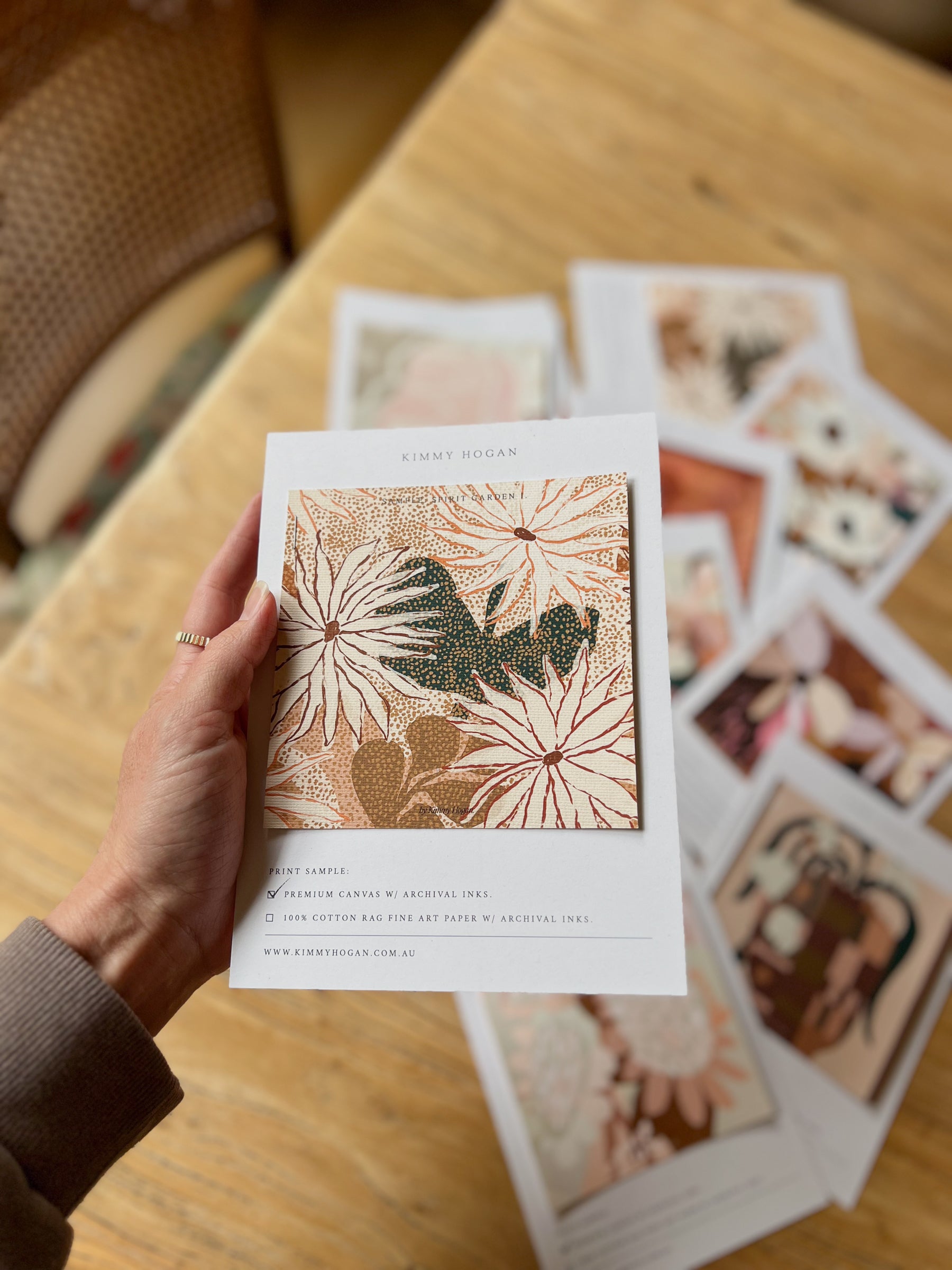 See, touch and feel the vibrancy and exceptional quality of my artwork at home. Samples are a beautiful and practical way to explore your favourites, and feel confident in your final artwork selection.