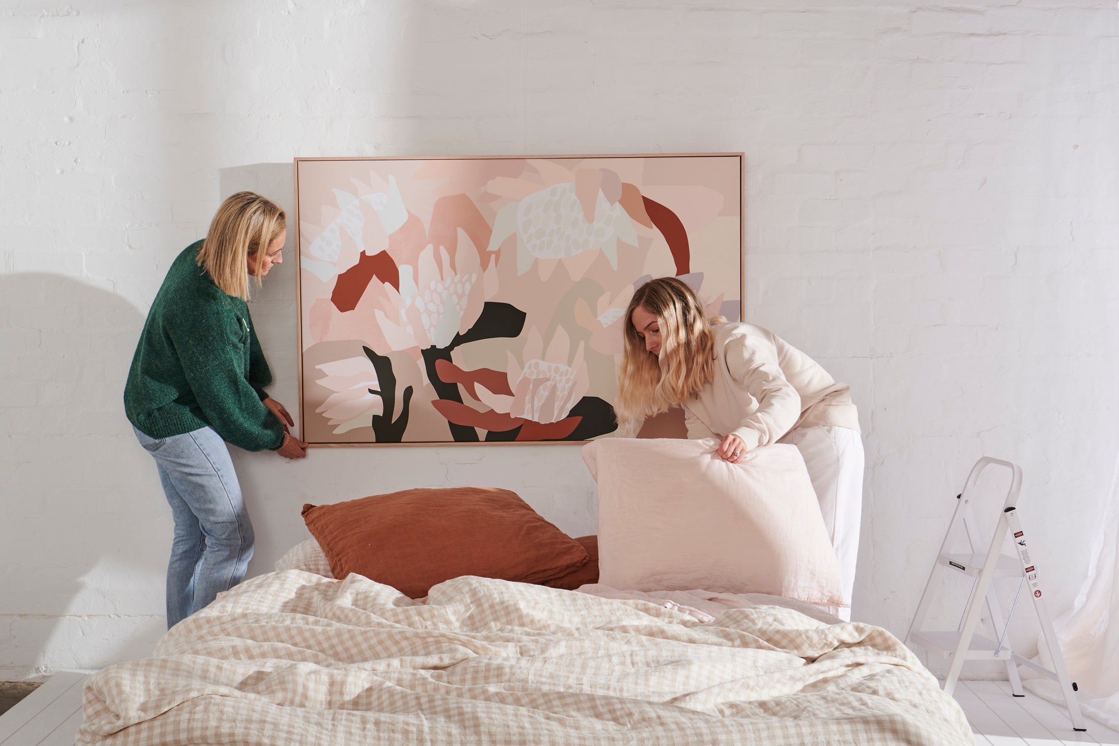 This is the fun part. First we start gathering some images of interiors that evoke the feeling and vibe we’re after. I source a lot of my inspiration images from Pinterest and Instagram. I then hunt for those brands that have that vibe – some brands I’ve loved for years or some I discover along the way. We marry each new artwork with a scene – we ask if it belongs in a bedroom or living room etc then go about sourcing the perfect furniture and décor items to make it all freaking beautiful.